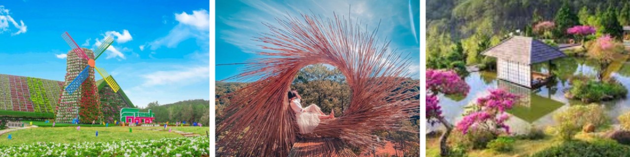 08h30: Than quan Vườn Hoa Cẩm Tú Cầu – nơi có Cầu Vàng Đà Lạt, Nấc thang lên thiên đường, Vầng trăng cổ tích, Cầu tình yêu, Cửa sổ, Tổ chim, Nhà gỗ, đặc biệt có thêm nhiều loại hoa như: hoa cúc hoạ mi, nữ hoàng xanh và hoa cánh bướm để quý khách tha hồ sống ảo.