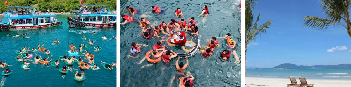 Tàu đưa quý khách đến với khu du lịch Bãi Tranh. Quý khách nhận ghế dù nghĩ ngơi, tự do tắm biển tại đây.